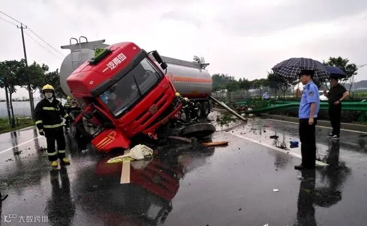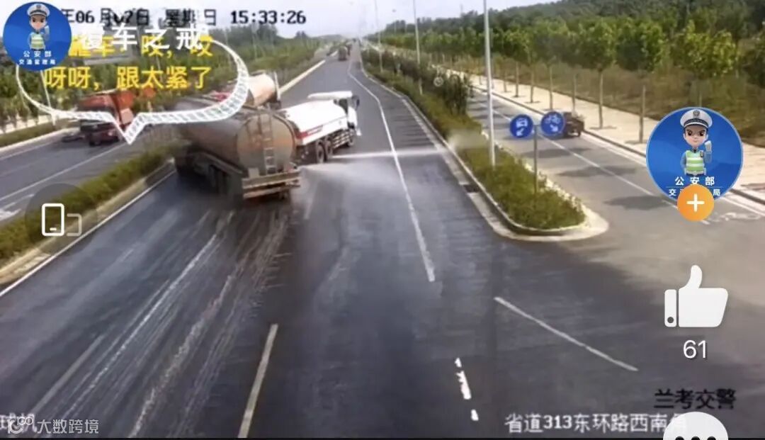 6月15日,在河南兰考,驾驶人刘某驾驶重型罐式半挂车,沿兰考县240国道由南行驶至与313省道交叉口处,由于跟车距离太近,在刹车过程中撞向右前方同方向行驶的非载货专项作业车,致罐式半挂车内汽油泄漏。