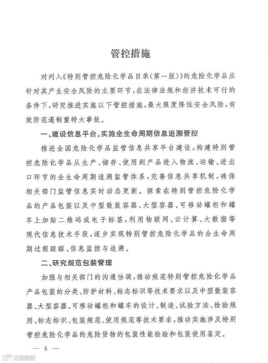 对列入《特别管控危险化学品目录(第一版)》的危险化学品应针对其产生安全风险的主要环节,在法律法规和经济技术可行的条件下,研究推进实施以下管控措施,最大限度降低安全风险,有效防范遏制重特大事故