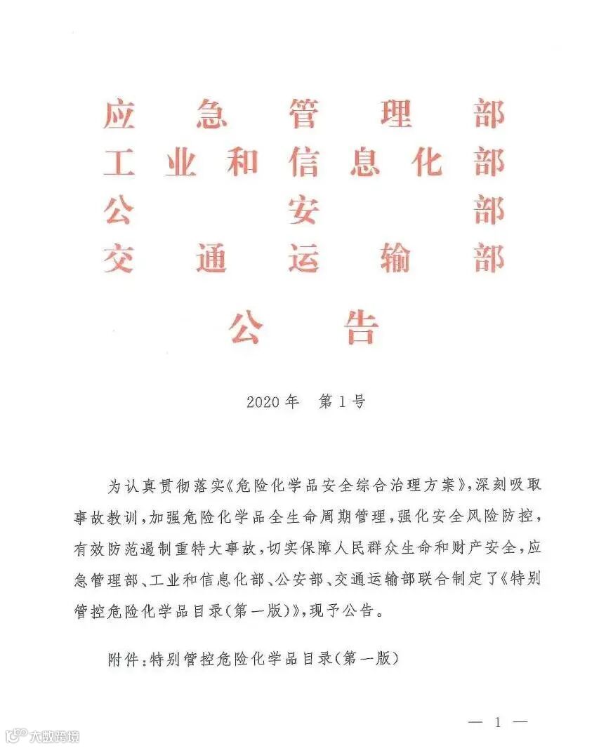 2020年6月2日应急管理部办公厅印发了《特别管控危险化学品目录(第一版)》其中规定了管控措施: