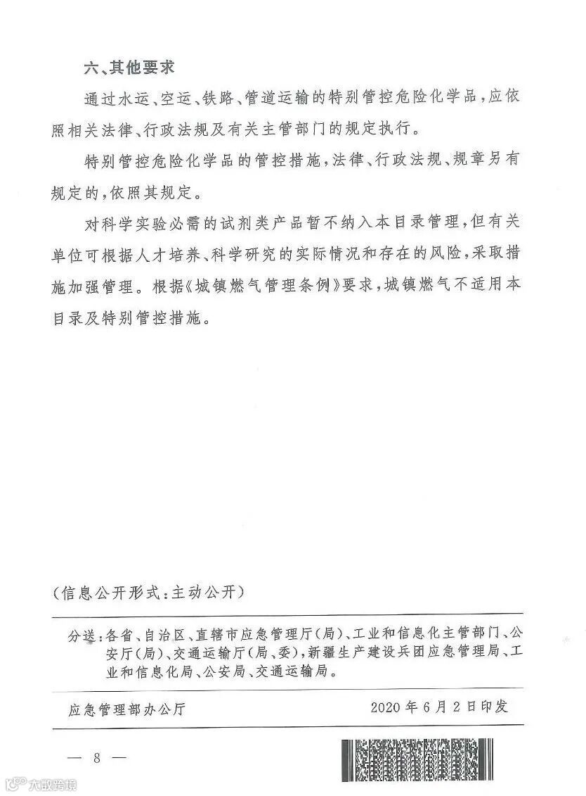 六、其他要求通过水运、空运、铁路、管道运输的特别管控危险化学品,应依照相关法律、行政法规及有关主管部门的规定执行。特别管控危险化学品的管控措施,法律、行政法规、规章另有规定的,依照其规定。对科学实验必需的试剂类产品暂不纳入本目录管理,但有关单位可根据人才培养、科学研究的实际情况和存在的风险,采取措施加强管理。根据《城镇燃气管理条例》要求,城镇燃气不适用本目录及特别管控措施。
