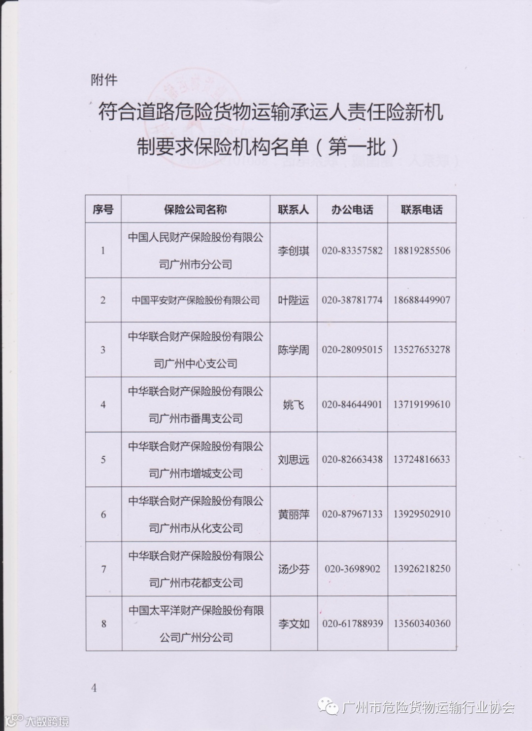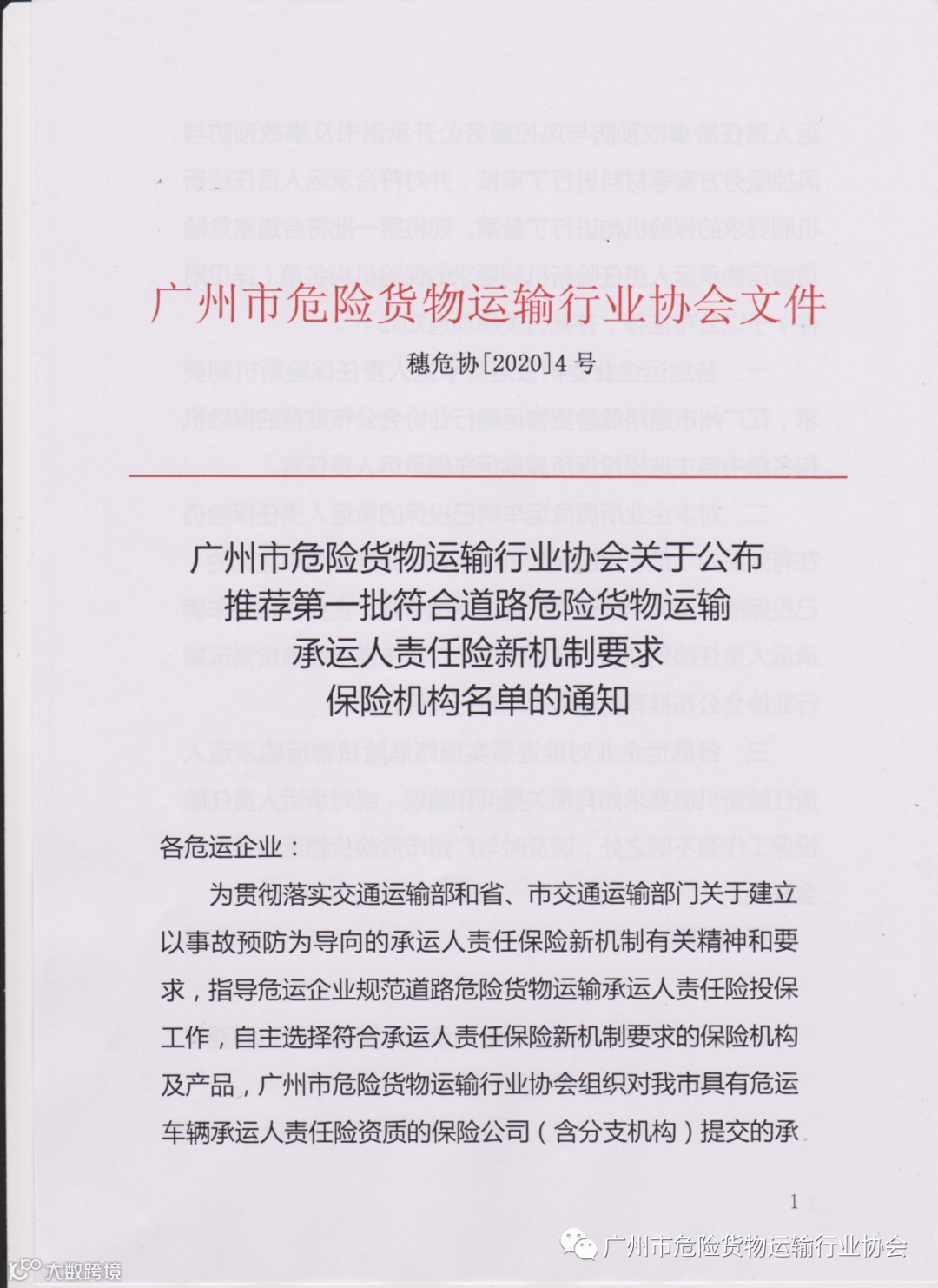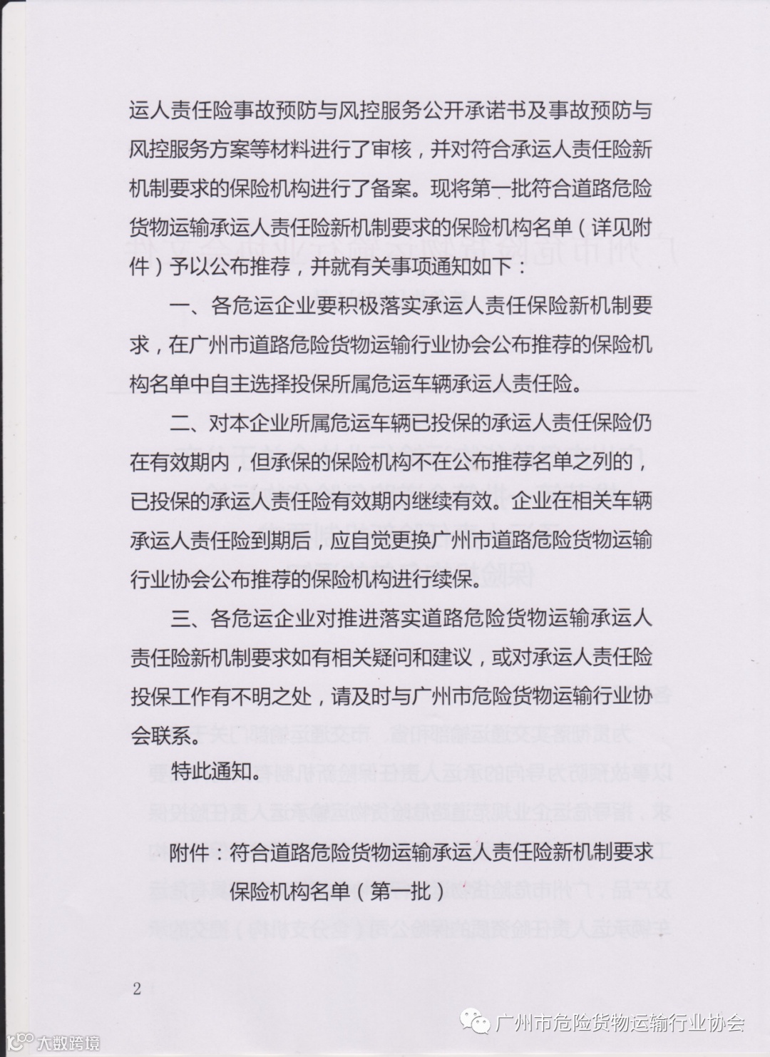 导读:关于公布推荐第一批符合道路危险货物运输承运人责任险新机制要求保险机构名单的通知