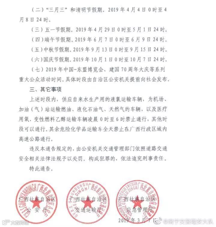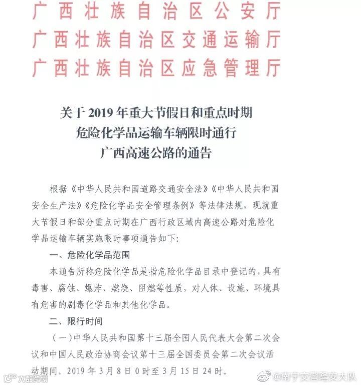广西壮族自治区公安厅、交通厅、应急厅关于2019年重大节假日和重点时期危险化学品运输车辆限时通行广西高速公路的通告