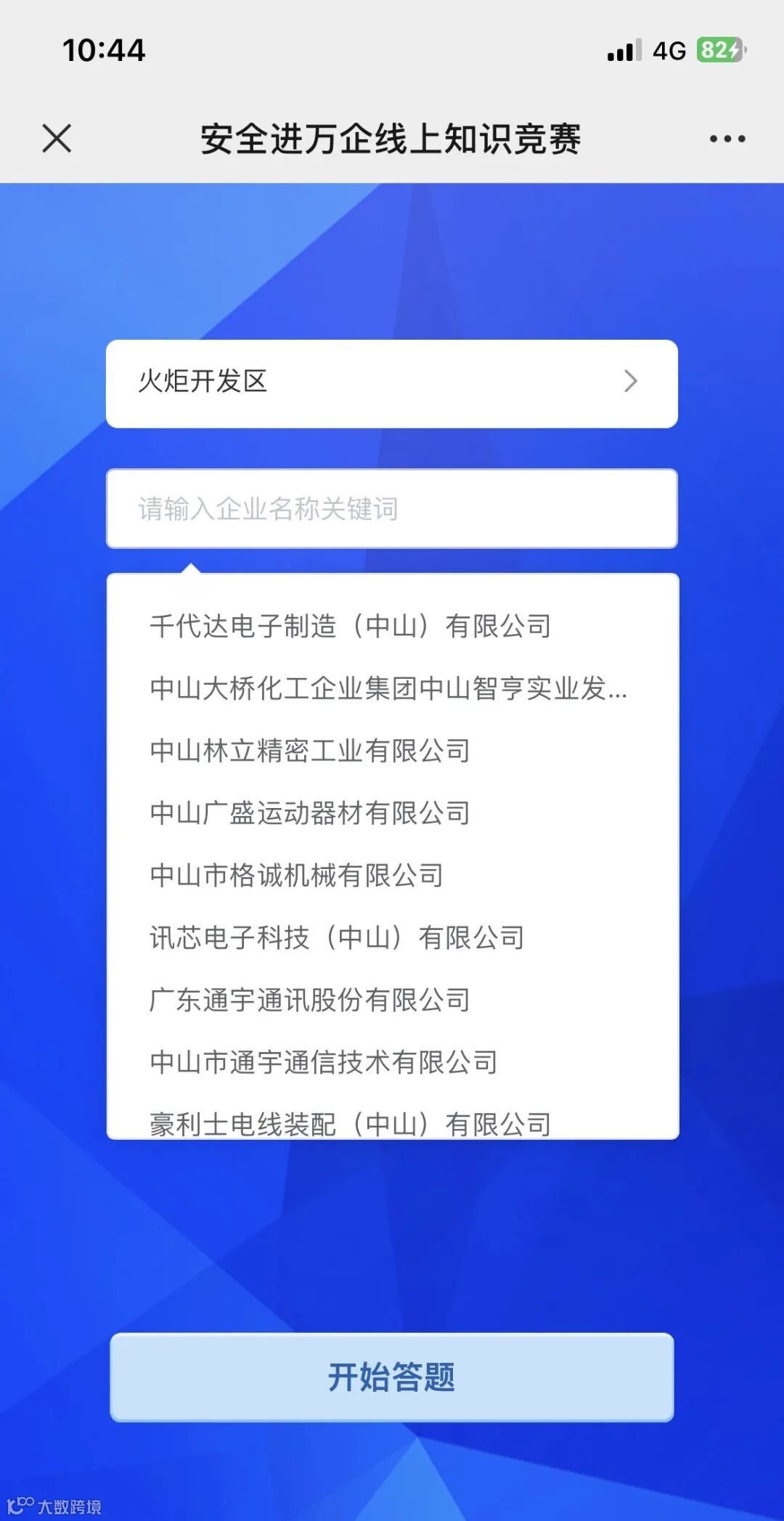 4、来到企业填报界面,在选择企业所属镇街后,输入企业名称关键词,在下拉菜单中选择所属企业,就可进入答题环节。如下拉菜单没有显示企业名称,完成手动输入企业名称,也可进入答题环节。