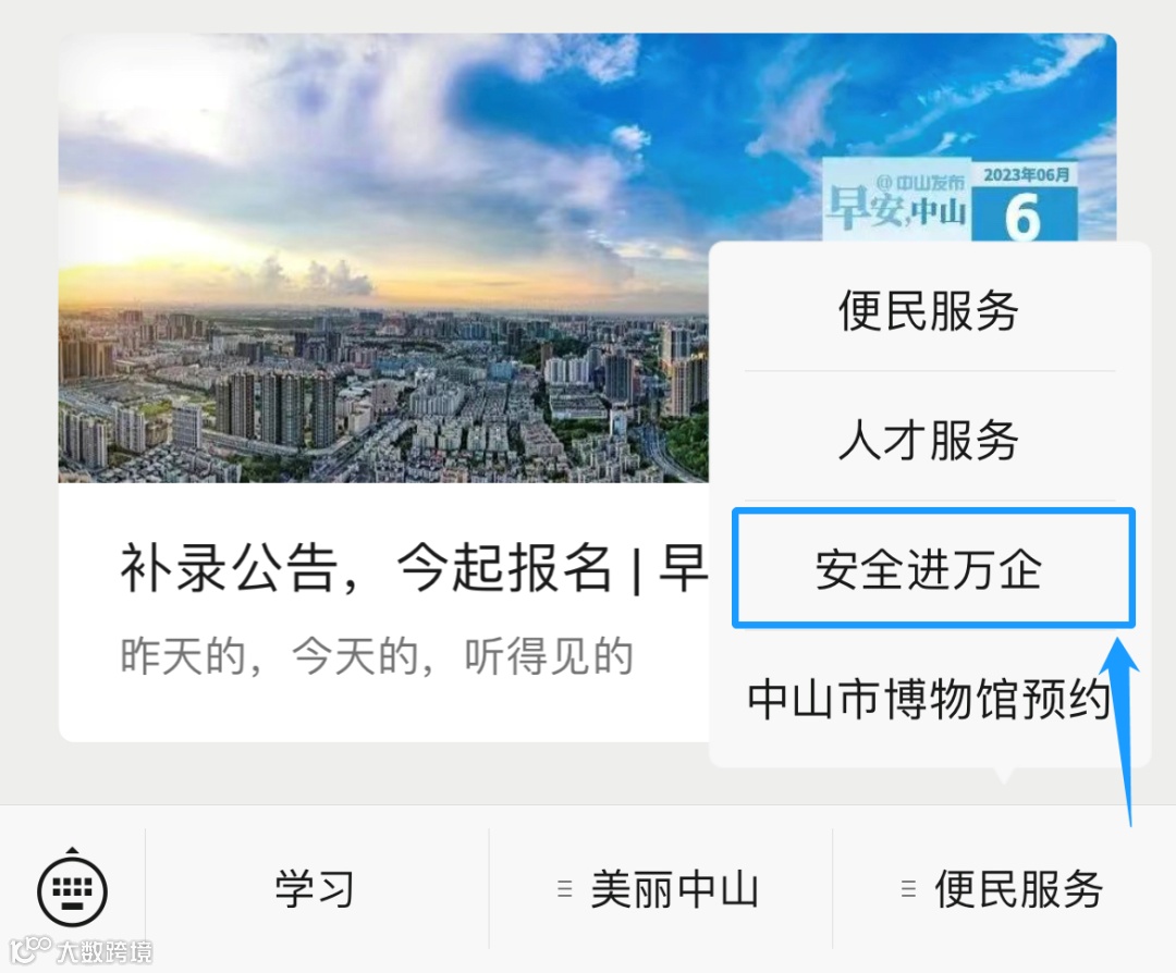 2、点击公众号主页右下方菜单栏“便民服务”,选择“安全进万企”进入答题界面。