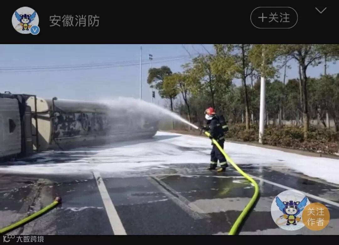 2月16日,合肥一辆满载28吨柴油的油罐车侧翻泄漏,罐体破裂,消防员赶到现场,了解到已漏出约十余吨柴油,立即展开稀释,随后环保、交警到场,前来支援的塘西河救援站临时封闭路口并警戒。成功倒罐后,侧翻油罐车被拖走,消防员继续清理现场排除险患。