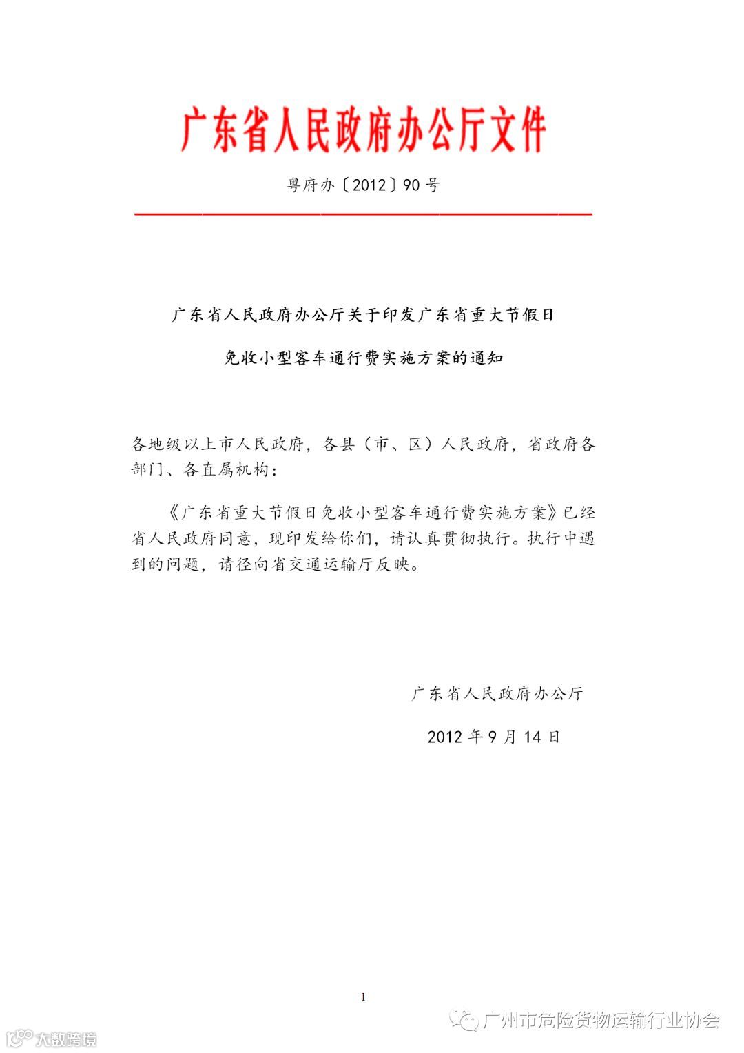 免收小型客车通行费实施方案的通知粤府办〔2012〕90号