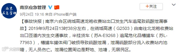 9月24日13时38分左右,在南京六合区绕城高速由南往北龙袍收费站出口匝道内发生交通事故,半挂货车(苏A-)追尾危化品槽罐车(苏L-),槽罐车罐体阀门破损导致硫酸泄漏,泄漏硫酸部分流入收费站内池塘,无人员伤亡。泄漏位置周边是野地、池塘,无居民区。截止15时10分,受损槽罐车成功堵漏,事故原因调查及其他善后工作正在进行中。