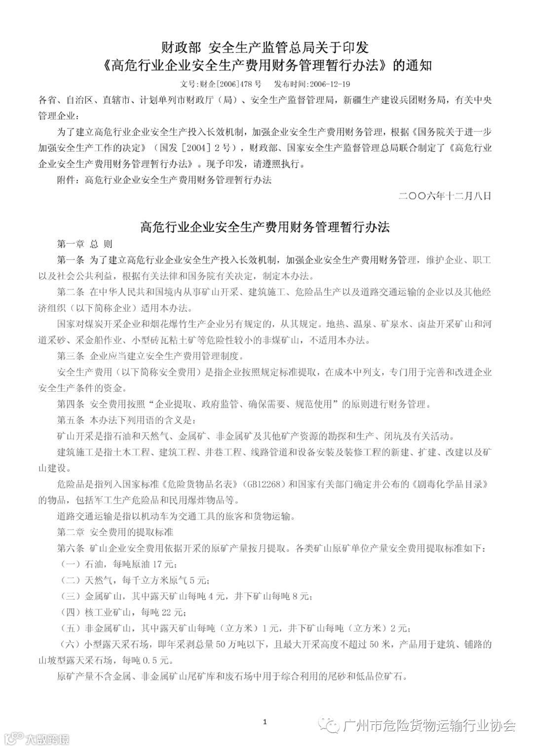 导读:财企[2006]478号文《高危行业企业安全生产费用财务管理暂行办法》