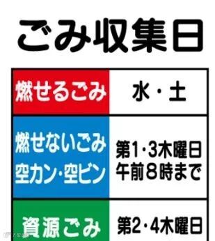 不可燃垃圾:每月第1和第3个周四早上8点前收