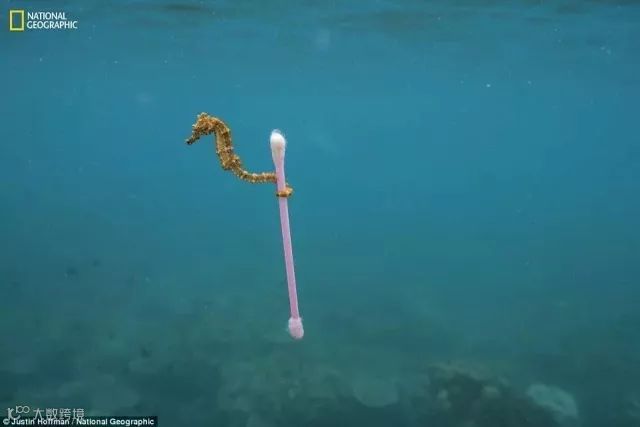 海马为避免被洋流冲走,时常会抓着一根海草,这只海马抓着的是一根棉签。