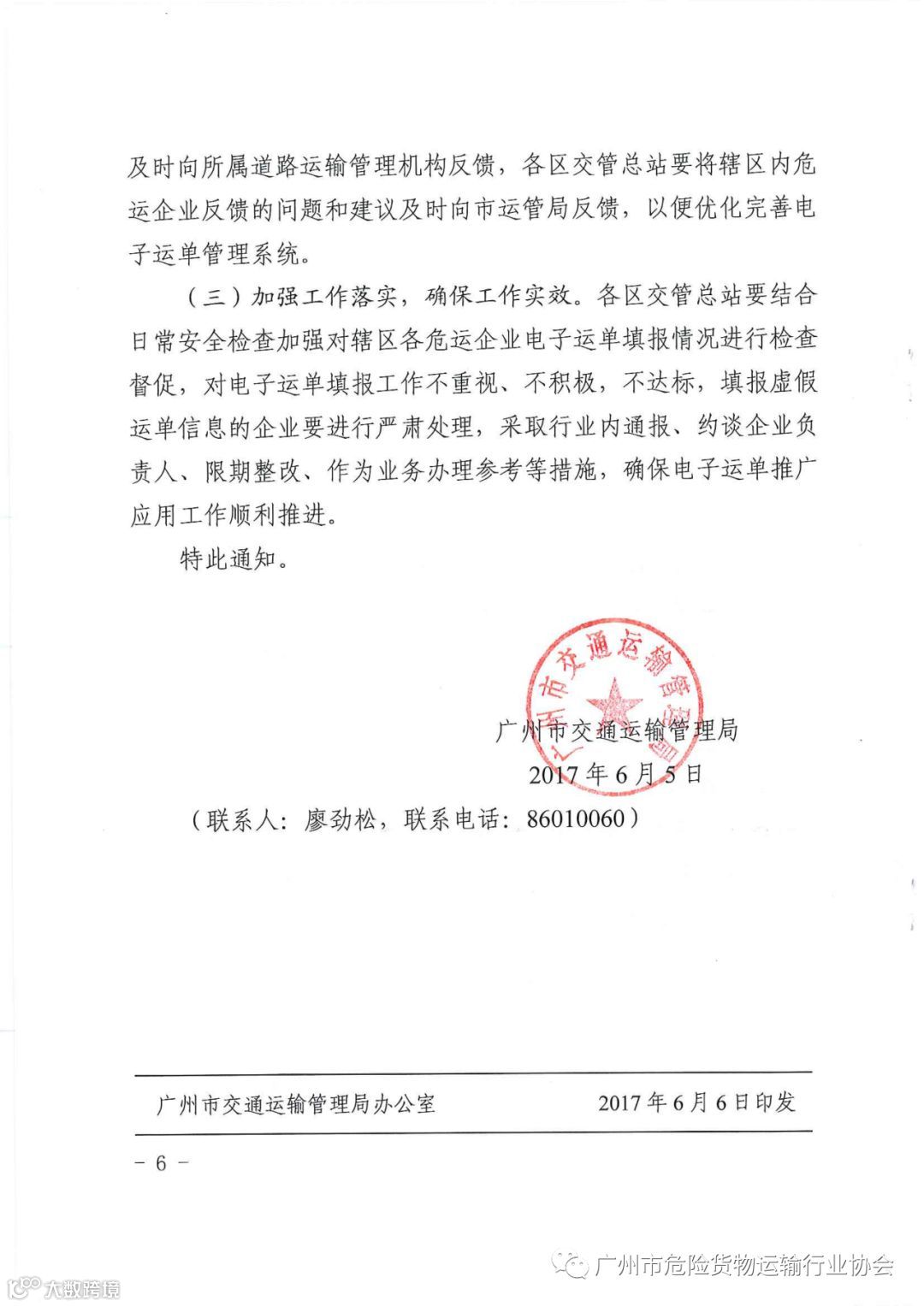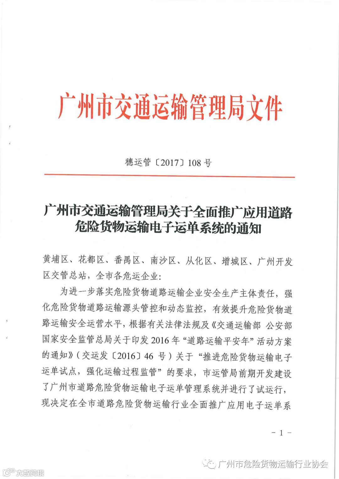 导读:关于全面推广应用道路危险货物运输电子运单系统的通知穗运管【2017】108号
