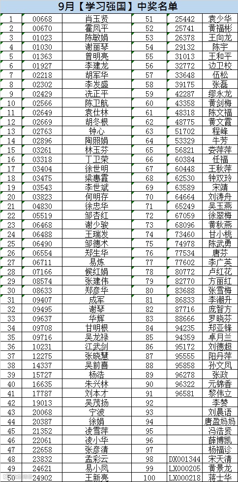 9月【学习强国】中奖名单来了~
