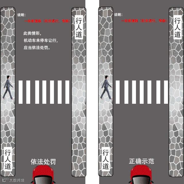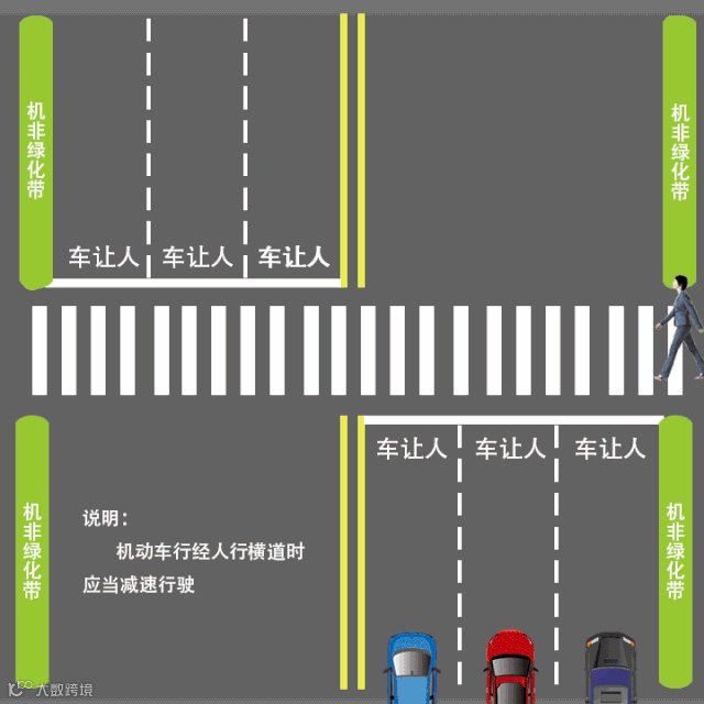 所以,斑马线上如果没有行人通过,开车时必须减速让行,也就是说司机要有刹车的动作;而当斑马线上有行人通过,司机必须要完全停下来让行。