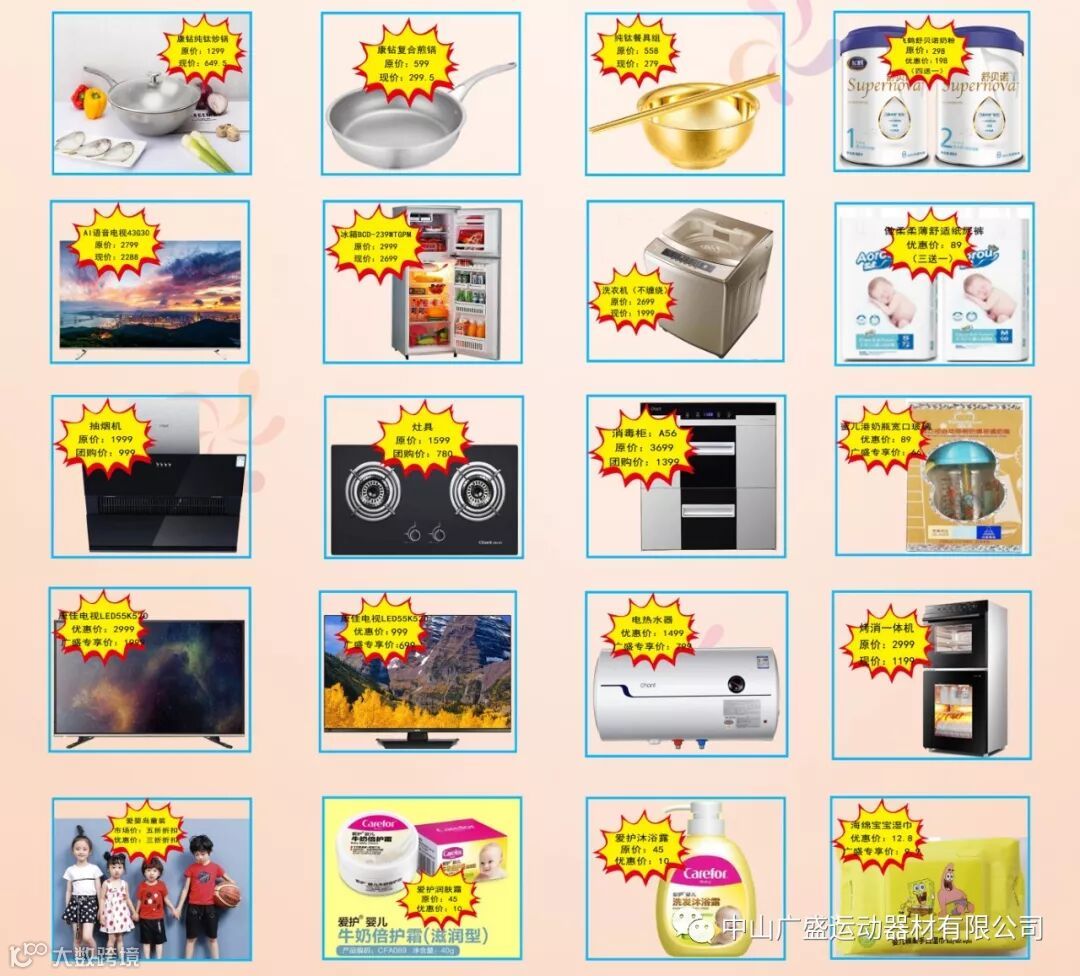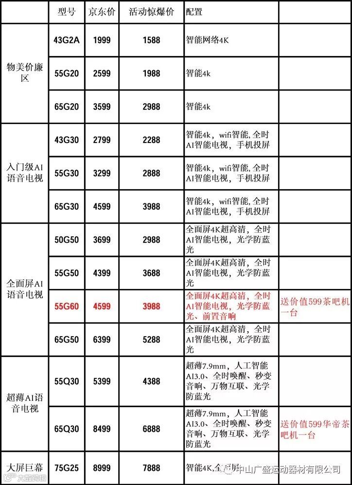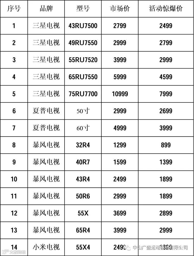 2、提前预定,享全国包邮服务:凭中山市广盛运动器材有限公司工牌,可于活动前提前预定电视,预交20元,可享受全国包邮服务,再送洗衣液一瓶。