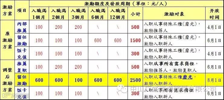 应订单成长,公司现储备特殊工种磨光及一般工种(含复合材、保卫)人力,8月份每周一、三、六均开放一厂外部招聘,内部推荐人员(男:18~38周岁、女:18~40周岁,均可推荐)优先办理入职。8月起再次提升磨光新人留任激励(由原1500元提升至2500元,追溯发放3月起入职磨光新人),同时继续启用所有需求岗位内部推荐、饭卡充值等激励方案。具体招聘实施细项说明如下,欢迎各位转发!