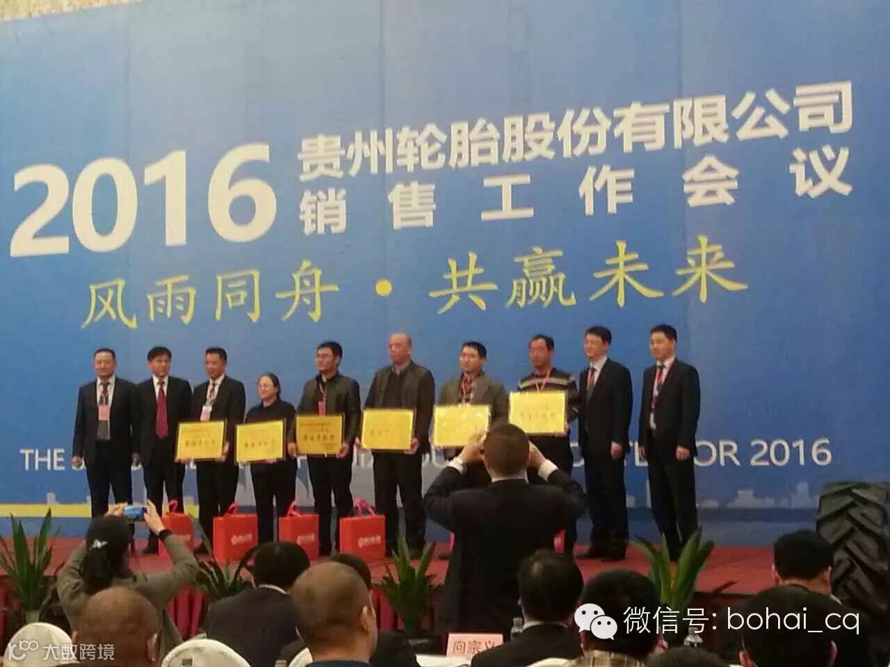 在会上,贵州轮胎股份有限公司的各位领导对2015年全国市场经济形势环境及全国各省市经销商的情况进行评析和总结,并对在2015年度全国表现极为优秀的六位省级经销商进行了表彰,授予了贵州轮胎2015年度最高级别”最佳贡献奖“荣誉奖牌,重庆博海商贸有限公司有幸获此殊荣。