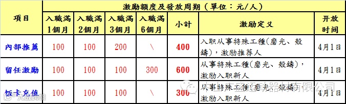 应公司订单成长,储备特殊工种磨光人力,4月份每周六开放一厂外部招聘,内部推荐人员优先办理入职。同时启用特殊工种内部推荐、饭卡充值、留任激励方案。具体招聘实施细项说明如下,烦请各位协助宣导推荐,谢谢!