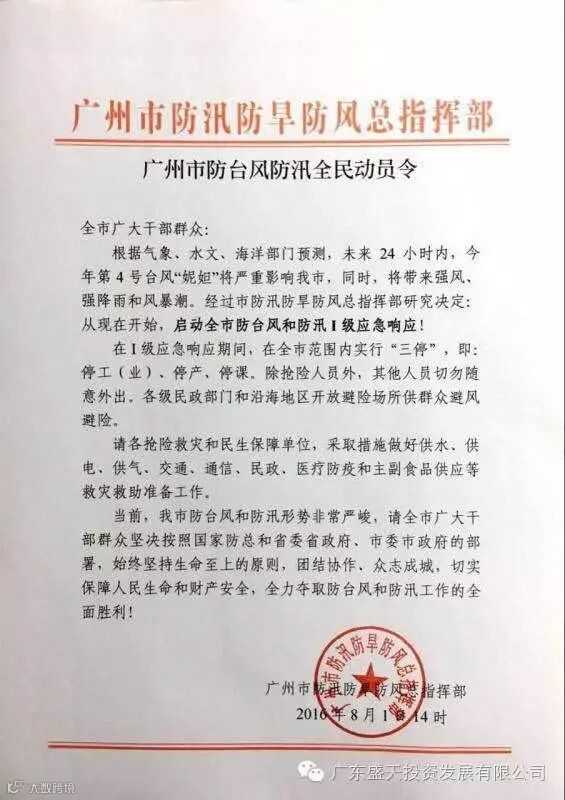 今天下午14时广州市防汛防旱防风总指挥部发布防台风防汛全民动员令,正式启动全市防台风和防汛I级应急响应,未来24小时内,台风将严重影响广州,带来强风与强降雨。为了保障员工人身安全,公司紧急通知如下: