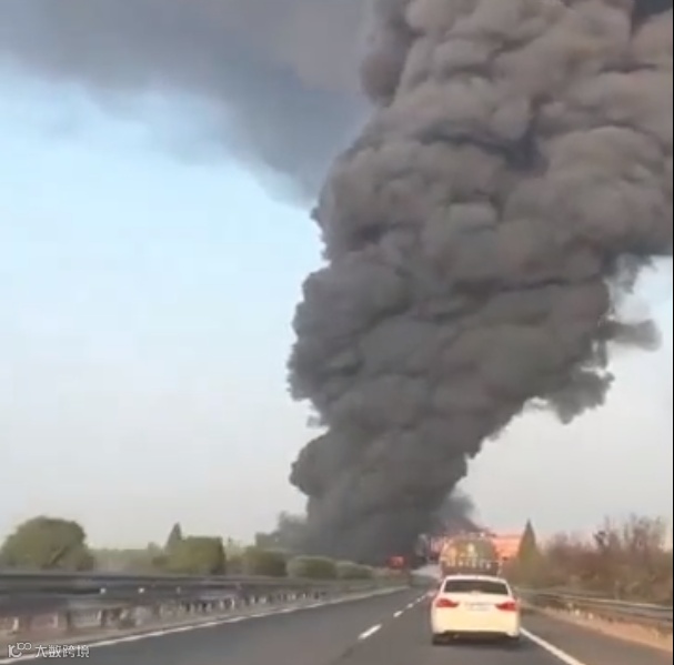 视频显示,现场因交通事故引发火情,滚滚黑烟不断向上空弥漫,距事故地点数公里外仍能看见。