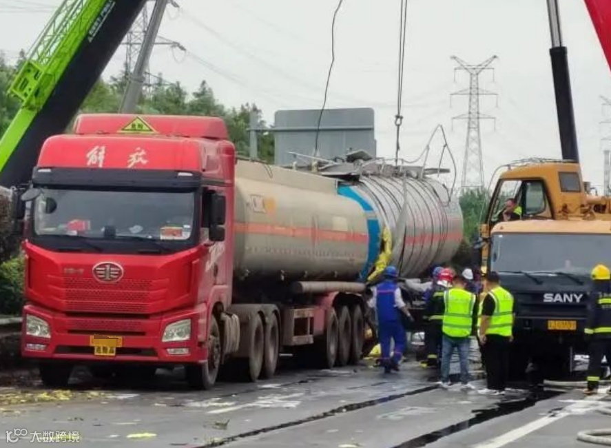 根据现场险情,公安交警部门第一时间封锁事故现场,禁止一切车辆靠近,消防大队出动消防车对事故车辆罐体进行喷射冷却,联系吊车对其进行罐体扶正工作,随后由危化品运输公司救援抢险队使用相关设备将泄漏罐车内的“高沸点芳烃”进行抽取,并转移至指定安全区域。