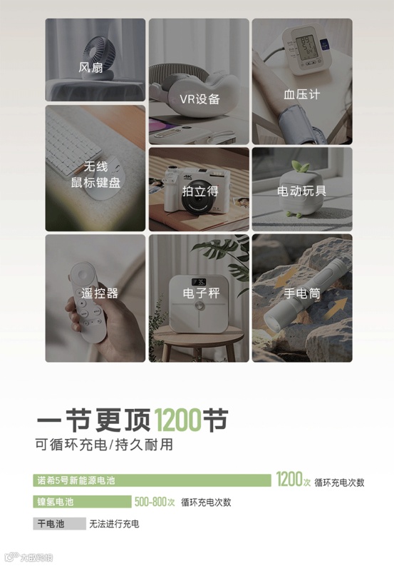 诺希5号7号电池搭配大容量高性能电芯,比传统电池更耐用。其卓越的兼容性更是一大亮点,支持市面上多数数码产品。无论是常见的空调 ,电视遥控器、鼠标键盘,还是智能门锁、儿童玩具、血压计、手电筒 等设备,诺希电池都能完美适配。无需再为不同设备寻找不同型号电池而烦恼,一盒诺希5号7号电池套装,满足家庭多种设备用电需求,真正实现高效兼容,为用户带来便捷的用电体验。