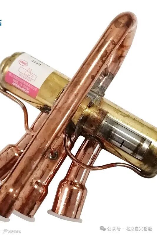 组件中的四通阀浸没在水中进行更换(最好能设计简易适用的工装),为了控制四通阀组件管路件之间相对角度,可以采取拆下一根管路件重新装新阀焊接好后,再拆换其它管路件方法。更换过程中应保证新旧四通阀内部不被烧坏,确保新阀的焊接质量和旧阀退返后的分析效果;