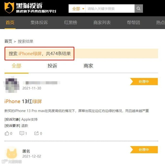 而且红绿屏情况还不止几个,近期在黑猫平台上出现了不少有关iPhone绿屏的投诉,这其中主要涉及的型号为iPhone 12和iPhone 13,而有关iPhone 绿屏的投诉已经接近五百条。