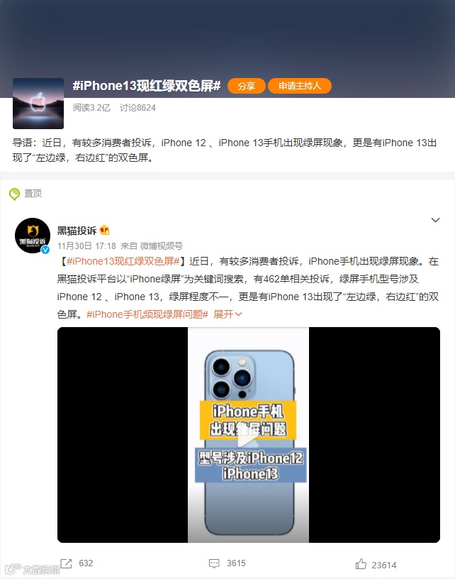 但才没乐呵两天,苹果又因“iPhone出现红绿双色屏”的负面话题再次冲上热搜榜首