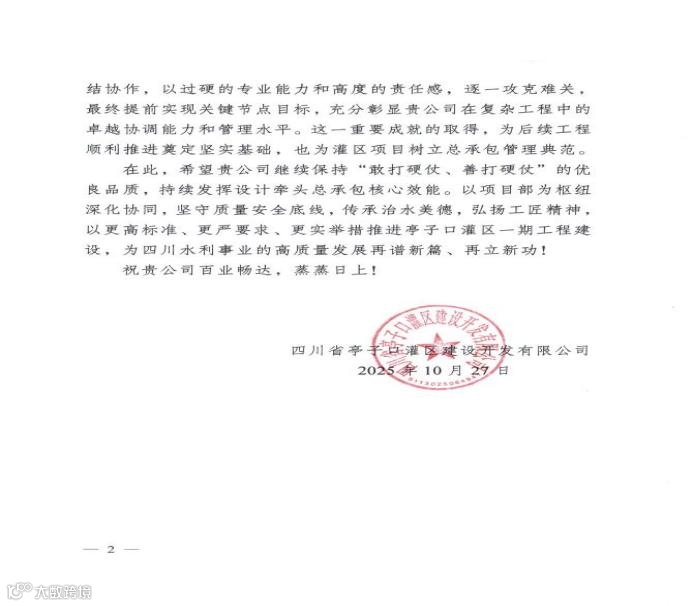 2025年的圆满收官,为亭子口灌区一期工程项目的整体竣工奠定了坚实基础。下一步,项目部将继续保持昂扬向上的奋斗姿态,总结经验、乘势而上,以更高标准、更严要求、更实举措推进后续工程建设,全力冲刺项目最终收官目标,努力打造经得起历史和人民检验的精品工程、示范工程,为“治水兴川”战略实施贡献更大力量。