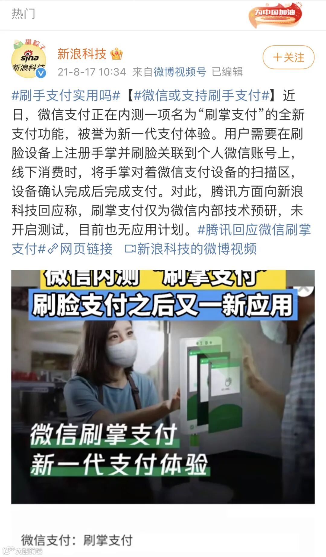 当时还上了微博热搜,引起了一波关注,只是腾讯当时表示,刷掌支付仅为微信内部技术预研,未开启测试,目前也无应用计划。