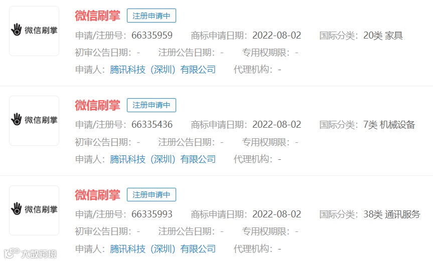 腾讯于近日提交了“微信刷掌”系列商标申请。
