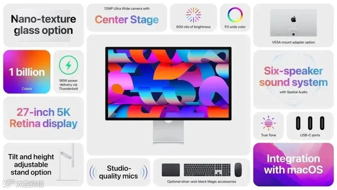 同为 Studio 系列的 Studio Display 配备27英寸5K视网膜显示屏,显示亮度最高600尼特,支持 P3广色域,10bit 色深和原彩显示功能,搭配 Mac Studio 简直不要太绝。