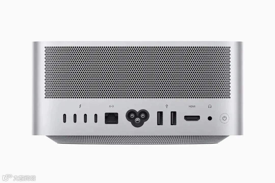 Mac Studio 机身为容纳两个独立风扇,将自身高度提升至9.5厘米,大约为 Mac mini 的2.7倍,长宽方面则与 Mac mini 一致。