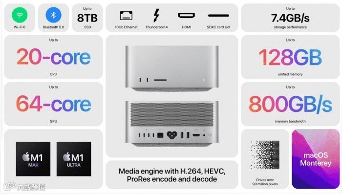 在能耗比上,M1 Ultra 对比同级别 PC 减少了近100W 的功耗,统一内存架构也得到了升级,最高支持128GB 统一内存,其内部还集成了同时驱动多台外接显示器的显示引擎。