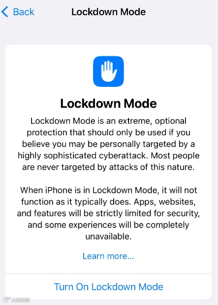 根据苹果官方描述,这是一项新的“极端”的安全功能,只有当您认为自己可能成为高度复杂的网络攻击目标时才使用。当iPhone处于锁定模式时,它将无法正常工作,应用程序、网站和其他功能将受到严格的安全限制。