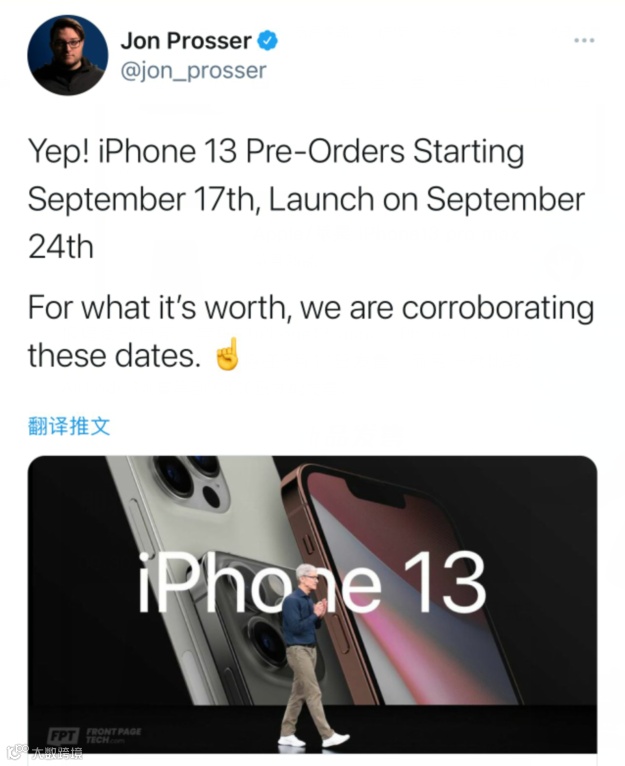 几乎是同一时间,Jon Prosser 也表示称,iPhone13 将在 9 月 17 日开启预售,9 月 24 日正式开售。