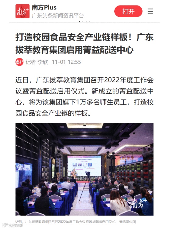 10月29日,2022广东拔萃教育集团年度工作会议暨菁益配送中心启用仪式在拔萃科技大厦成功举行。南方日报、广州日报进行报道。