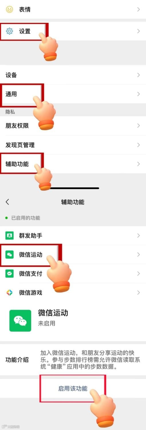 1.启用微信运动功能(步骤:打开微信一点击“我”→设置一通用一辅助功能一微信运动一点击“开启该功能”)。
