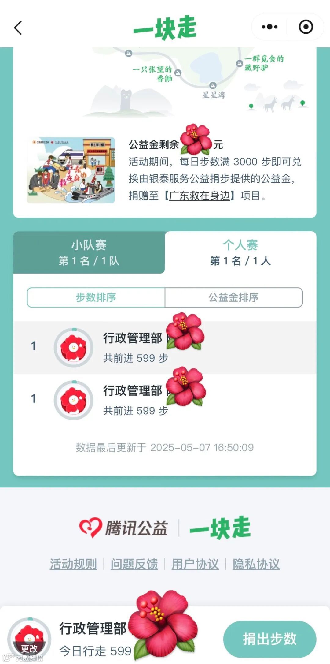 3.每人必须加入所属部门/项目的小分队,重复加入其他小队无法累计步数和捐赠记录!