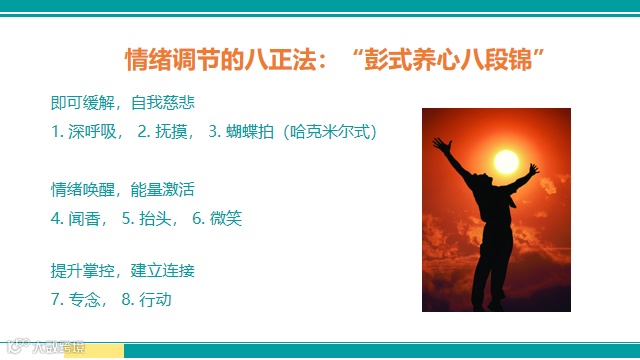 彭凯平教授还分享了简单实用的提升幸福感方法,即情绪的幸福“八正法”:呼吸调节、嗅觉唤醒、肢体接触、运动激活、专念觉察、倾诉释放、微笑训练、福流营造