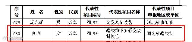 3月17日,国家文化和旅游部官网发布《文化和旅游部关于公布第六批国家级非物质文化遗产代表性传承人的通知》,确定了第六批国家级非物质文化遗产代表性传承人名单(942人),陈利被评为国家级非遗项目“醴陵釉下五彩瓷烧制技艺”国家级代表性传承人。