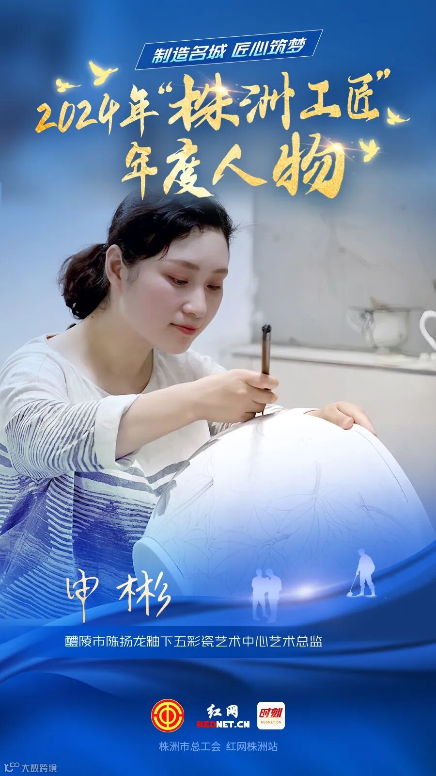 市委书记曹慧泉为当选的10名2024年度“株洲工匠”年度人物颁发奖章和证书,我司签约艺术家国家级非遗项目“醴陵釉下五彩瓷烧制技艺”省级代表性传承人申彬获此殊荣上台领奖。