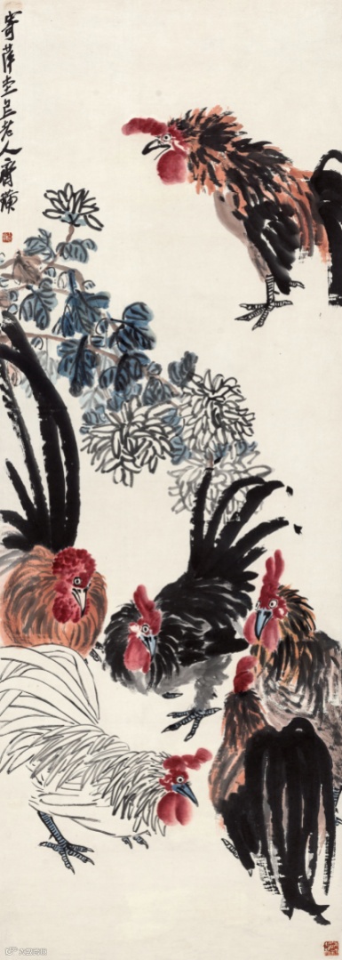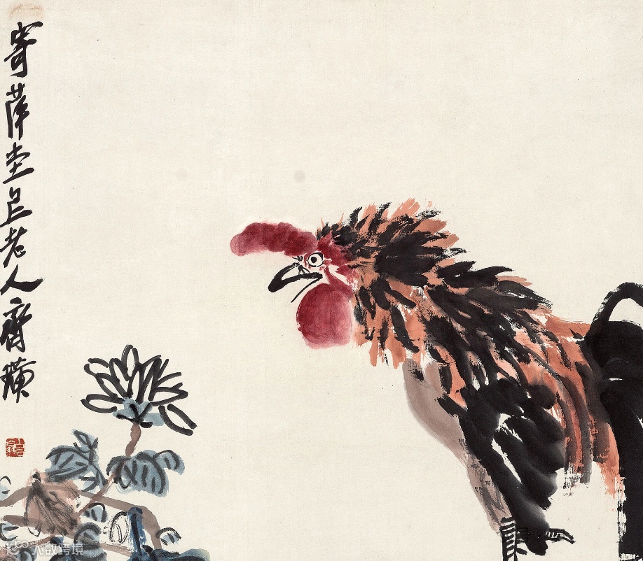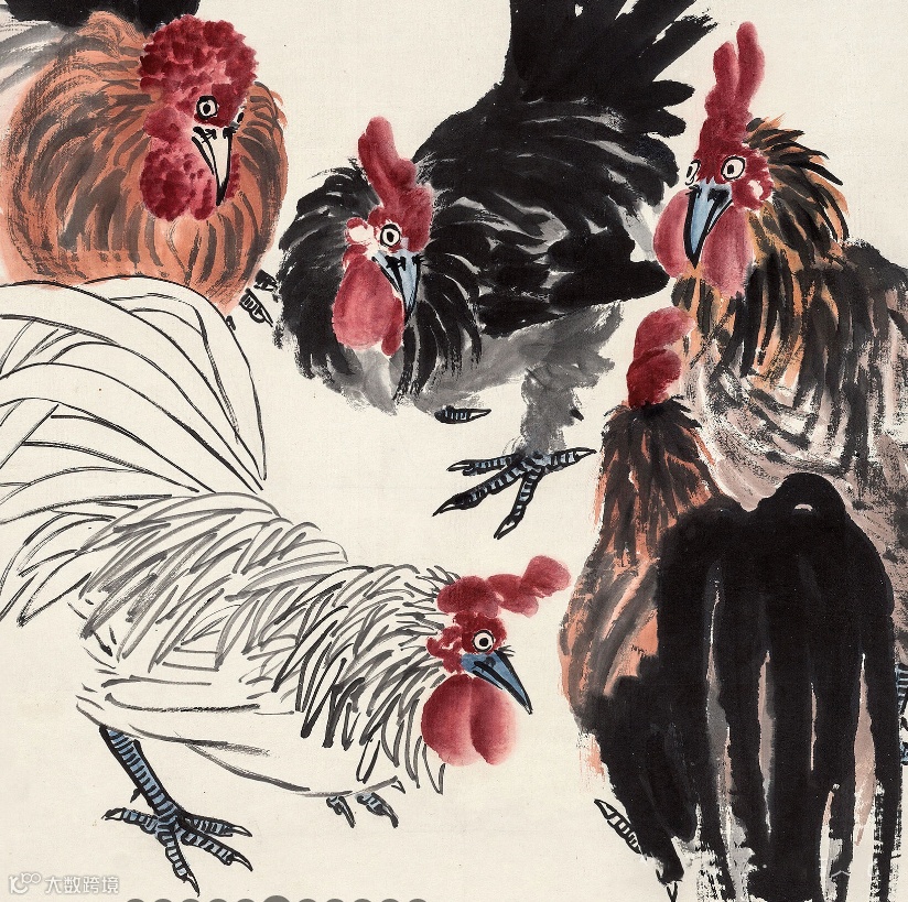 画面的构图匠心独运,画幅达到8尺之巨,展示了六只雄鸡和一丛淡菊。淡菊的存在巧妙地将画面分为上下两个空间,使得整幅作品呈现出深远而富有层次的空间感。六只雄鸡则按照上一下五的布局置于两个空间之中,既展现了画面的和谐统一,又凸显了每一只雄鸡的个性特点。