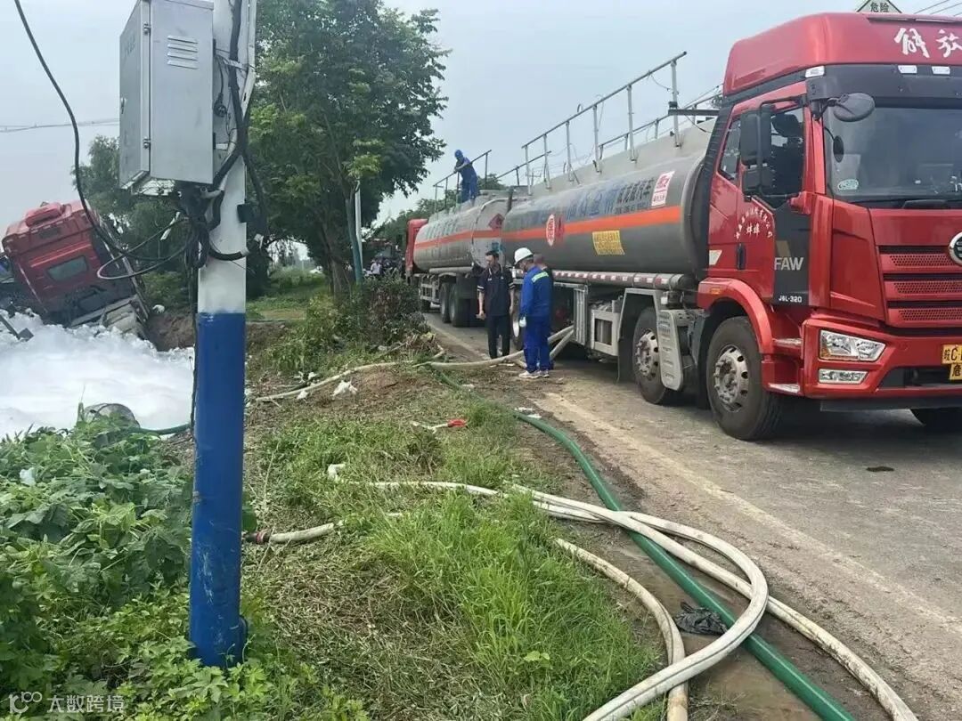 事件:6月27日凌晨1时许,山东籍鲁V半挂油罐车(载33吨95#汽油)行驶至蚌埠市淮上区沫河口洪庙村路段时,因夜间降雨路滑发生侧翻。