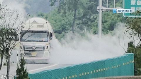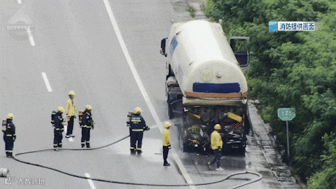 现场指挥部随即对各增援单位统一部署救援行动,扩大警戒范围,实施交通管制,排除警戒区一切火源,实时观察现场风向及液化天然气蔓延方向,引导20余辆车、30余名群众有序疏散。当下,营救被困人员是第一要务,根据实际情况,消防救援突击小组首先利用水枪出水掩护,再利用破拆工具组一点一点将货车驾驶室破拆和清理,10时53分,货车司机被成功救出,并转送给现场120医务人员。此时,21.2吨天然气仍在泄露,气化烟雾不断扩散,危险并未解除。