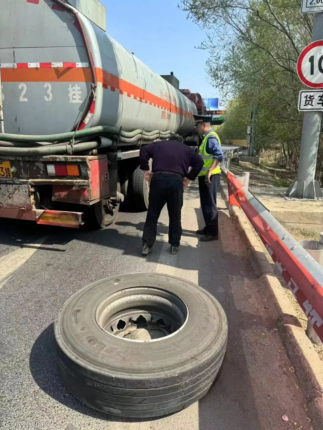 山东德州一油罐车爆胎并掉落