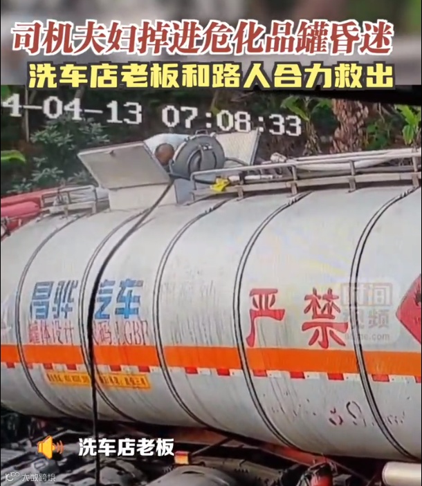 事件:4月13日,广东惠州惠阳区淡水东收费站附近一货车司机不小心掉入危化品罐内,疑似吸入化学气体昏迷,妻子去救也被困。