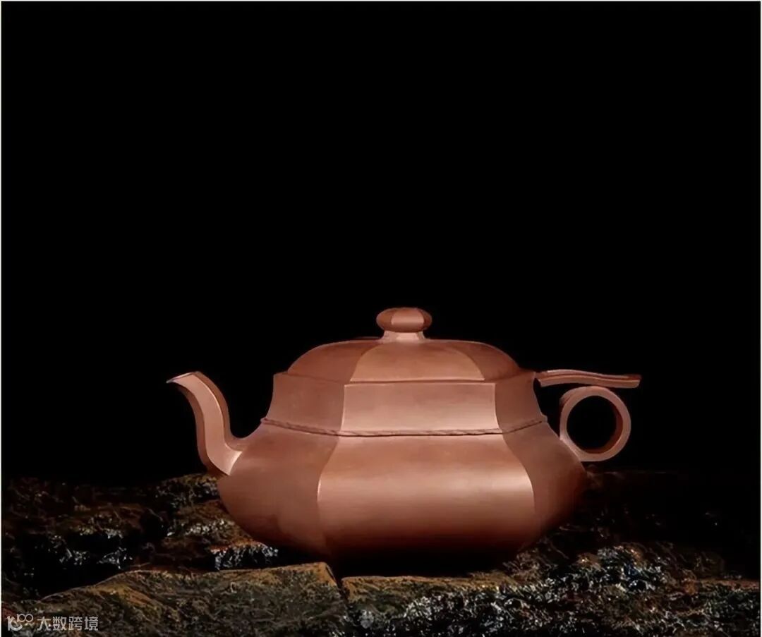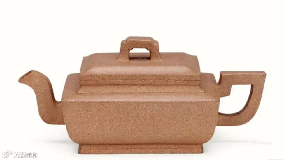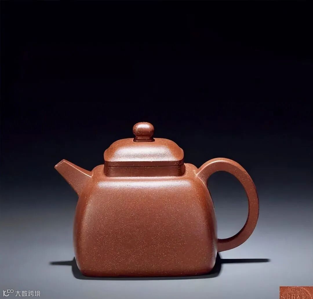 圆方形钮挺而大气,四面昂藏。耳形壶把四方形线条与壶体、壶流线条相呼应,转折迂回之间,舒畅自由。