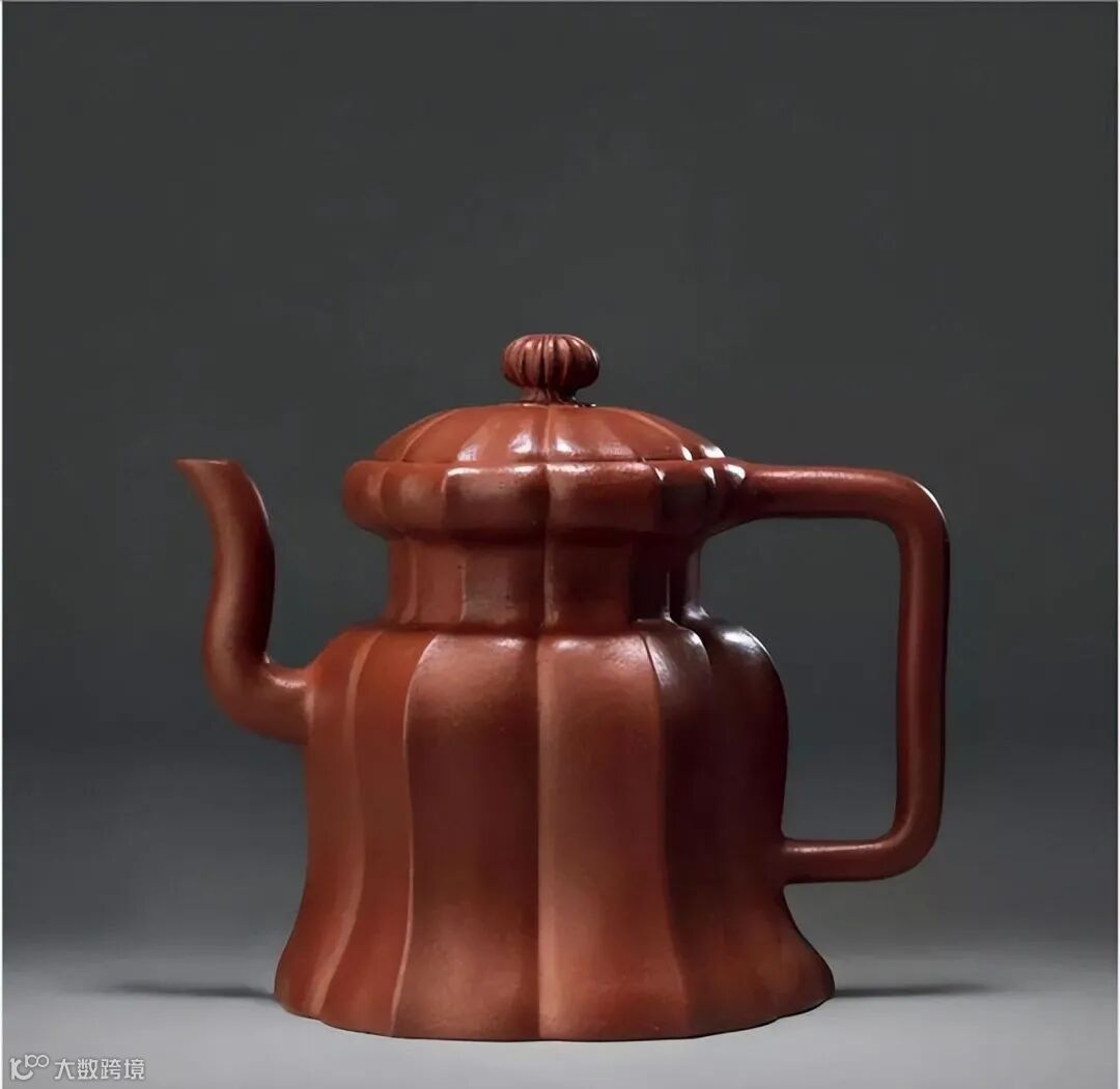 此裙花壶为朱泥作成,属明末筋纹器造型,壶身呈长方菱花瓣造型,左右对称,线条优美。菱花钮台座高耸,三湾流与壶把对应,呈一线贯气,整器筋纹饱满,棱角转折委婉,刚柔并济。