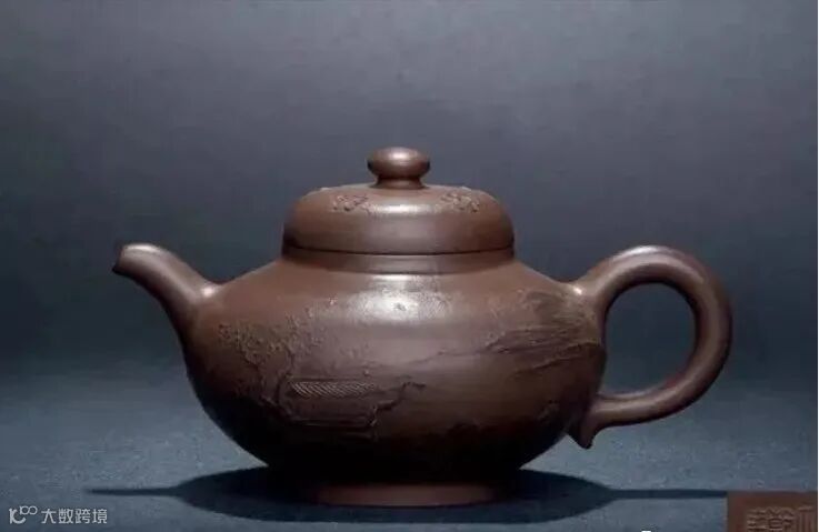 作者选单色泥质,以笔墨技法为之,构图上虚实结合,层层推进。底款模印“大清乾隆年制”双行篆书,乃官窑紫砂中常见的结字形式,说明这是一把清宫御制紫砂壶,它最初的主人即使不是乾隆皇帝也是皇室贵胄。
